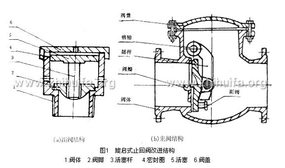 在原旋啟式止回閥閥瓣上增設緩閉副閥(圖1)。副閥安裝在主閥閥瓣下側或兩側且用螺紋聯(lián)接,介質(zhì)正常流動閥門開啟時,介質(zhì)壓力將副 閥打開,介質(zhì)通過副閥小孔流入主閥出口端,使主閥進水口端卸壓,主閥閥瓣開啟,主閥前后壓力趨于平衡;介質(zhì)逆流時,主閥閥瓣在逆流介質(zhì)作用下快速關閉,而副閥閥體上部為緩沖缸,副閥閥蓋旋入閥體上部其蓋上有一小孔,副閥閥瓣與其活塞桿空套有一定間隙,活塞與緩沖缸之間采用O型橡膠圈密封,活塞下部與閥瓣之間為平面密封;當副閥閥瓣隨主閥閥瓣關閉而關閉時,因副閥閥蓋小孔的作用,介質(zhì)通過小孔逐漸流入副閥緩沖缸上腔體,一部分介質(zhì)通過副閥閥瓣與活塞桿之間的間隙倒流,故副閥活塞是緩慢關閉的。該結構主閥的關閉相當于快關階段,副閥的 緩慢關閉相當于慢關階段,依據(jù)泵站機組水力和機械過渡機理說明該結構設計能有 效地防止水錘升壓。