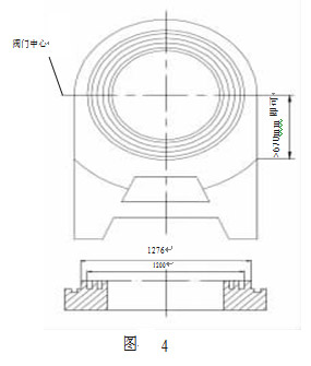 為電動(dòng)閘閥導(dǎo)軌和閥板的配合示意圖,導(dǎo)軌均為楔形結(jié)構(gòu),導(dǎo)軌與座圈組裝后,形成一帶角度的空隙,閥板導(dǎo)軌在此空隙間移動(dòng)。要求閥關(guān)閉后其閥板與閥座圈密封面的間隙平均小于 0.051mm。此閥為常開(kāi)閥,正常情況下,每年關(guān)閉不超過(guò) 1 次,關(guān)閉時(shí),一方面靠流通介質(zhì)的力量使閥板與座圈貼緊,另一方面,通過(guò)閥板楔入,使閥板與座圈的密封面貼緊,從而達(dá)到密封的目的。 該閥門(mén)的開(kāi)關(guān)行程為 1300mm,理論上座圈導(dǎo)軌的工作長(zhǎng)度是 1300mm(從閥門(mén)中心起),實(shí)際上座圈導(dǎo)軌除閥門(mén)通道口受流通介質(zhì)沖蝕外,其余部分只起導(dǎo)向作用,所以我們可以在滿(mǎn)足工況要求的前提下將座圈導(dǎo)軌的堆焊部位縮短,使其長(zhǎng)度大于環(huán)形密封面口徑的一半 670mm (從閥門(mén)中心起)即可。 考慮以上原因,我們調(diào)整加工工藝為:粗車(chē)平面及環(huán)形堆焊槽,粗車(chē)導(dǎo)軌堆焊部位(粗車(chē)圖如圖 4),劃導(dǎo)軌堆焊位置線(xiàn),堆焊,熱,校平,精車(chē)環(huán)形密封面,精刨導(dǎo)軌,在粗加工階段為盡量增大工件的剛性,同時(shí)減少工序周轉(zhuǎn),座圈尾部先不加工,精加工完環(huán)形密封圈及導(dǎo)軌后,在導(dǎo)軌與環(huán)形密封面夾縫處仍有大量毛坯高出密封面及導(dǎo)軌,須將其去除,我 們采用銑加工。