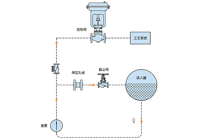 連續(xù)循環(huán)系統(tǒng)泵的最小需求流量與系統(tǒng)的工藝流量變化無關。最小流量設定好后經(jīng)過減壓孔板直接回流至儲罐,連續(xù)的最小流量循環(huán)雖然可以很好的保護泵,但是必須泵提供更大輸出功率以保證系統(tǒng)工藝流量加上再循環(huán)流量,造成額外的能源浪費。